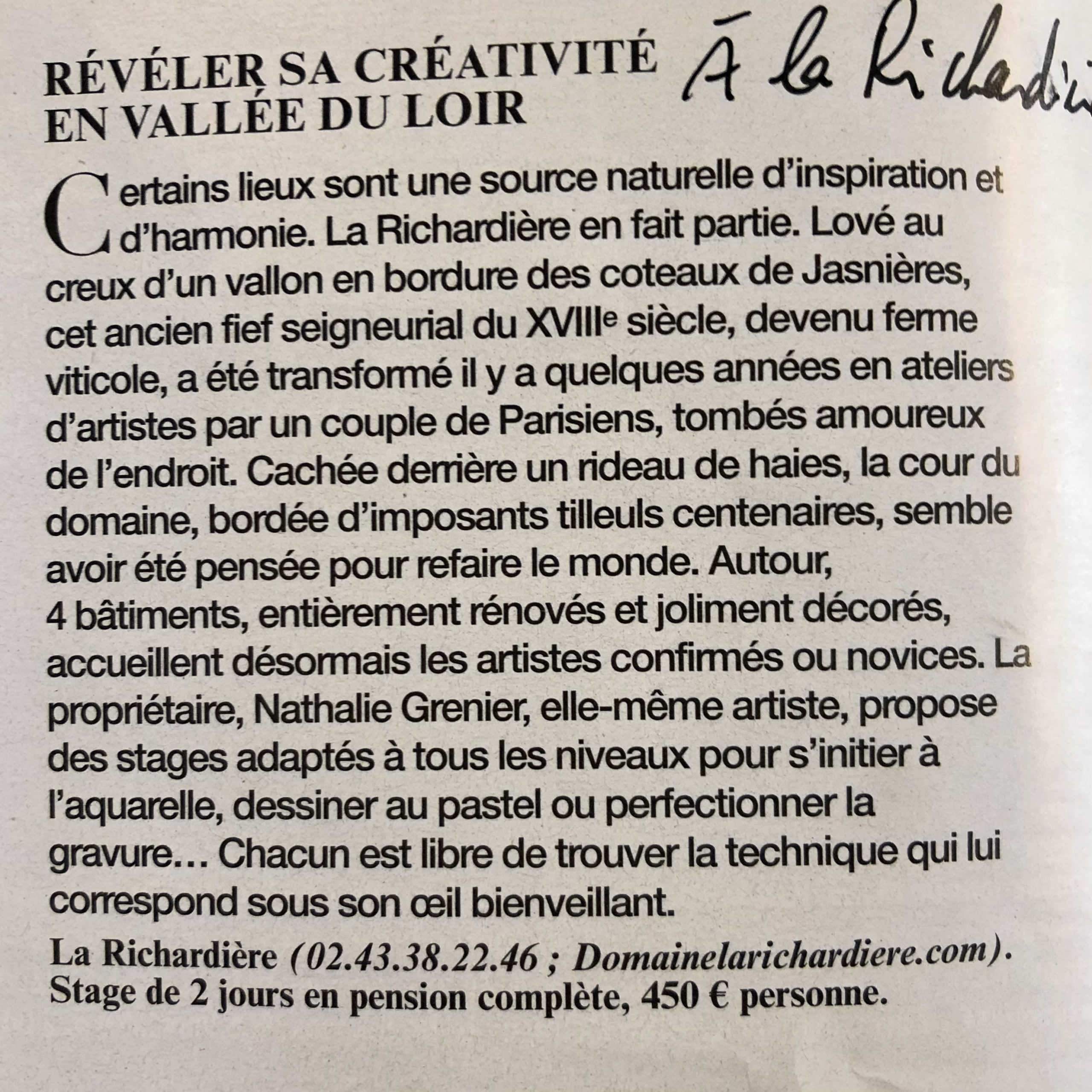 La presse a sélectionné la Richardière, le figaro magazine en parle dans sa sélection de 50 escapades en France et en Europe, 14 mai 2021, page 80.